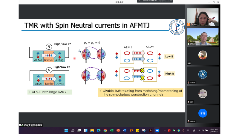 坚持“停学不停研”的抗疫原则,材料学院李桃教授于2022年1月17日邀请中国科学院合肥物质科学研究院固体物理研究所邵定夫研究员做客材料学院,在线上进行了题为《Antiferroic tunnel junctions》的学术报告,介绍了铁电、铁磁材料在新一代芯片材料中的应用前景以及在反铁磁/反铁电器件领域的研究成果。本次讲座由李桃教授主持,材料学院近50名师生在线参加了该学术报告会。