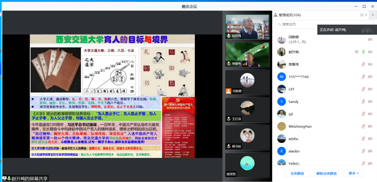 赵升吨教授以“家国情怀铸就制造强国之辉煌”为题讲述了专业课课程思政建设情况。他结合学校发展定位和人才培养目标,紧密围绕国家和区域发展需求,在“复杂机电系统的人工智能控制技术”课程中,融入了诗词歌赋、区域特色、历史文化以及国家制造业和工业发展史等思政元素,多角度、全方位地展示了思政元素融入专业课程建设的方式方法以及全面覆盖、层次递进、类型丰富的课程思政框架,做深做实立德树人工作,为大家后期开展课程思政建设提供更广阔的视角和维度。