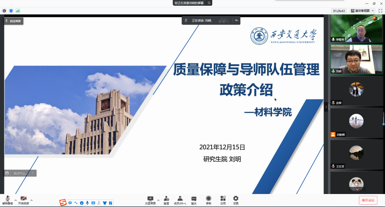 刘明副院长作题为“质量保障与导师队伍管理政策介绍”的报告,介绍了材料学院历年研究生生源情况、近五年的按期授位率和学位论文抽检等情况,并重点解读了《西安交通大学关于进一步加强研究生学位论文质量保障的若干意见(试行)》文件精神。他希望各位研究生导师能够规范学位申请流程,严把学位论文质量关,进一步提高研究生培养质量。