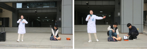 最后,校医院急诊科主任、主任医师周哲人针对急救原则、心肺复苏、自动体外除颤器(AED)使用等实践项目开展了技能培训。利用假人模型,她给在场师生演示了判断意识所需的操作,示范胸外按压时掌根需要按压的位置及频率,并详细介绍了AED使用的操作流程及注意事项。